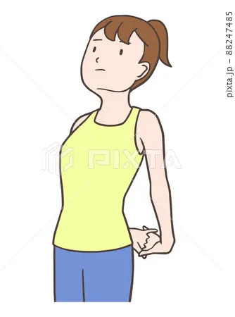 ① 両足を開き、背筋を伸ばして立つ。胸を開き、両手を体の後ろで組み
